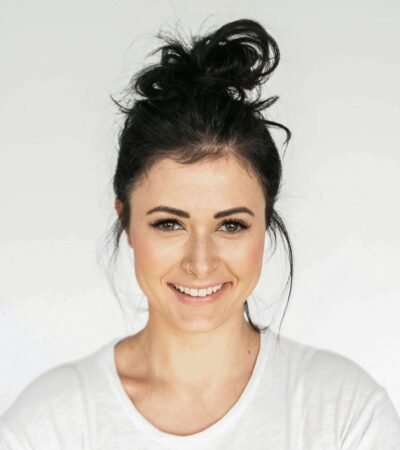 A close-up view of a car's alloy wheel, prominently featuring the BMW logo. The wheel is modern and sporty with multiple spokes and a visible blue brake caliper. The background consists of a lush green hedge, and the car is parked on a wet, textured surface.